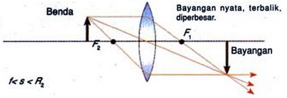 Dari gambar diatas dapat kita ketahui bahwa sifat bayangan pada benda yang dihasilkan di atas ialah nyata terbalik dan dapat diperbesar.