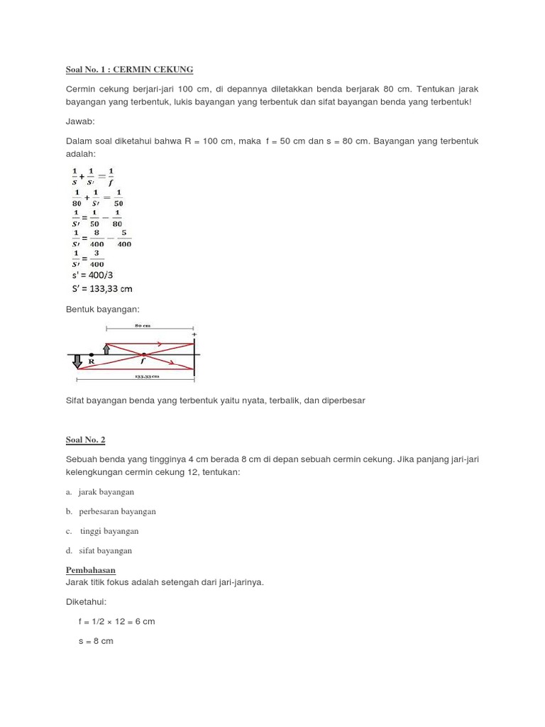 Nilai fokus cermin cekung bernilai positif. Contoh soal cermin cekung cermin cekung berjari jari 100 cm di written by fisikasanclar march 17 2020 march 18 2020. Setelah kita mengetahui tentang apa yang dimaksut dengan cermin cekung berikut ini merupakan karakteristik yang dimiliki oleh cermin cekung yaitu. Dalam soal diketahui bahwa r 100 cm maka f 50 cm dan s 80 cm.