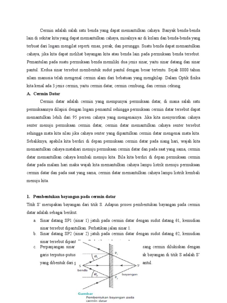 Cermin lengkung ada dua macam yaitu cermin cembung dan cermin cekung. Cermin datar cermin datar yaitu cermin yang permukaan bidang pantulnya datar dan tidak melengkung. Cermin adalah keping kaca yang salah satu permukaannya sangat halus dan di bagian belakangnya kasar serta berlapis emulgram perak sehingga tidak tembus cahaya. Cermin cembung memiliki sifat divergen menyebarkan cahaya karena berkas cahaya yang datang dan mengenai permukaan cermin cembung akan dipantulkan kembali dari satu titik dan menyebar.