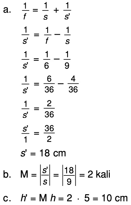 Jarak bayangan yang terbentuk ke cermin. Rumus hubungan jarak fokus dengan jari jari kelengkungan cermin rumus hubungan jarak benda jarak bayangan dengan jarak fokus atau jari jari kelengkungan cermin rumus perbesaran bayangan rumus nomor ruang dan rumus sifat sifat bayangan. Cermin cekung mempunyai panjang fokus 5 cm. S 20.