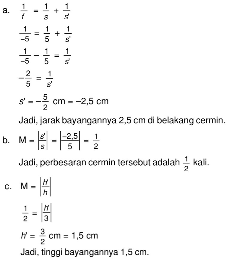 Jika jarak fokus lensa 20 cm tentukan. Sebuah benda yang diletakkan di muka sebuah cermin cekung membentuk bayangan nyata 4x besar benda. Bayangan nyata benda ini oleh cermin dibentuk pada jarak 30 cm. Sebuah benda tegak tingginya 2 5 cm diletakan di depan cermin cekung berjari jari 24 cm pada jarak 30 cm dari cermin.