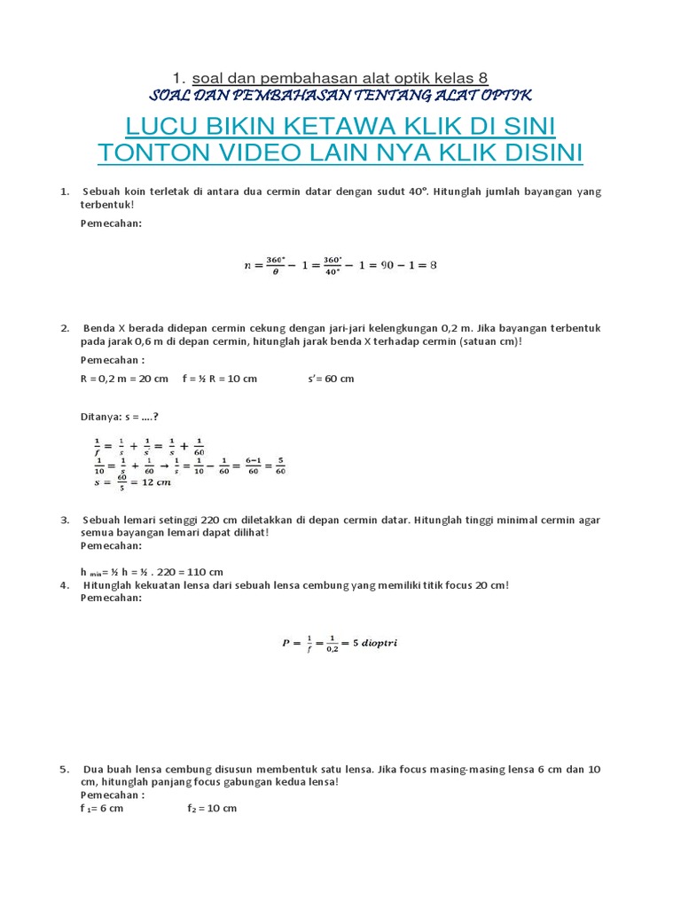 Soal fisika cermin dan lensa kelas 8. Legurules matematikakelas8 luasdankelilinglingkaran video kali ini membahas materi fisika kelas 8 cermin 1 cermin datar sifat cermin datar bayanga. Sunday february 26 2017 fisika. A cermin cembung dengan jari jari kelengkungan 112 cm. Jarak titik fokus lensa soal no.