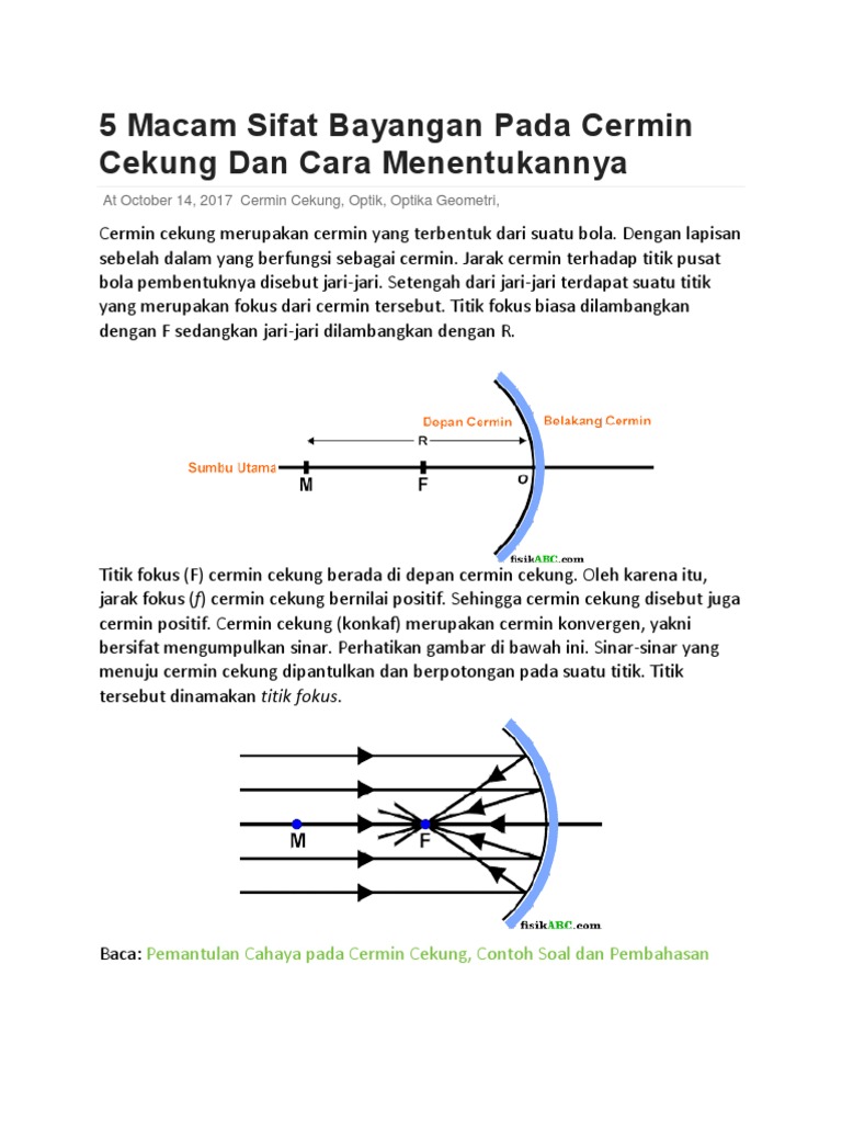 Cermin cekung mempunyai panjang fokus 5 cm. Jika benda berada di titik pusat kelengkungan cermin p maka bayangannya juga akan berada di titik p dan bersifat nyata terbalik sama besar 3. Dari gambar diatas dapat kita ketahui bahwa sifat bayangan pada benda yang dihasilkan di atas ialah nyata terbalik dan dapat diperbesar. Cermin cekung bersifat konvergen yaitu bersifat mengumpulkan sinar yang datang padanya.